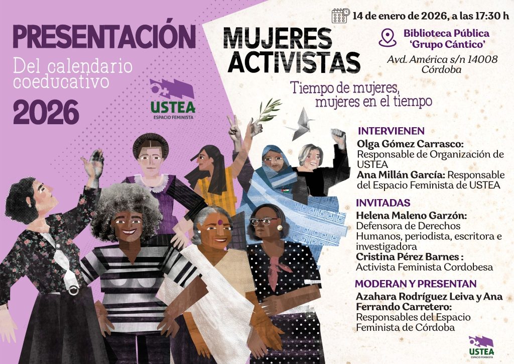 El Espacio Feminista de USTEA, que está dentro de la Organización de Mujeres de la Confederación Intersindical, ha presentado en Córdoba, el 14 de enero de 2026, una nueva edición del Calendario Coeducativo “Tiempo de Mujeres, Mujeres en el Tiempo”, que este año está dedicado a las Mujeres Activistas.
